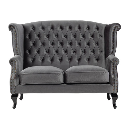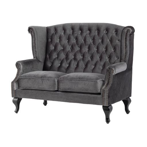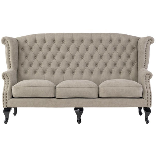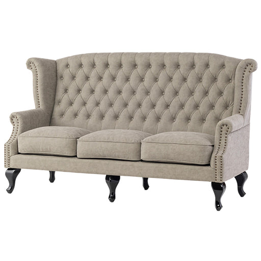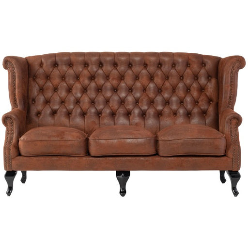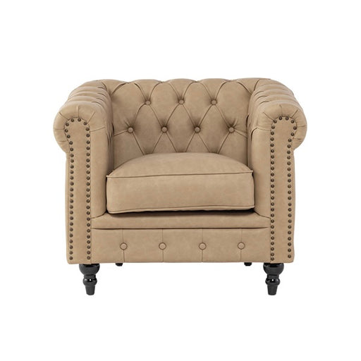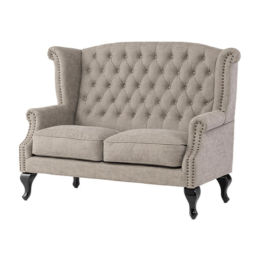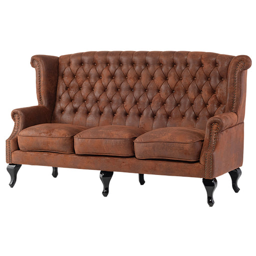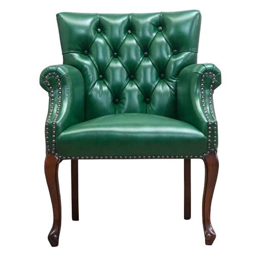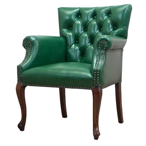 【コメント】 英国スタイルのコーナーチェア。ボタン留めや飾り鋲が本格的で、味のある彫刻を施した脚部も見応えがあります。