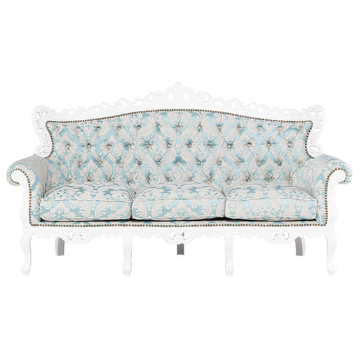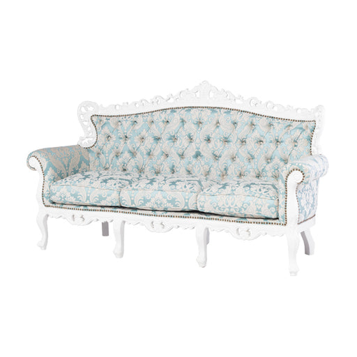 【コメント】女性的なフォルムのラグジュアリーソファ。お花の彫刻も素敵ですヨ♪こだわりのクッションは、優しい沈み込みもありながら安定感もある座り心地で、長時間座っていても疲れる事なく、まるで包み込まれるようです。※本物のアンティーク家具のような雰囲気を演出するために、彫刻部などにクラシカルな塗装...
